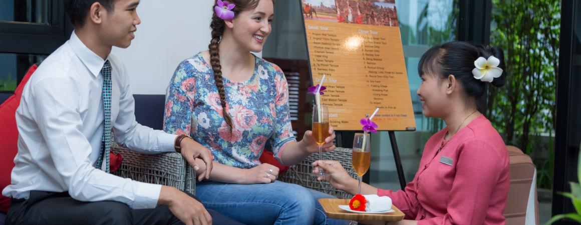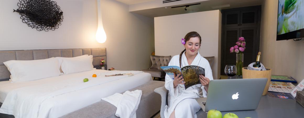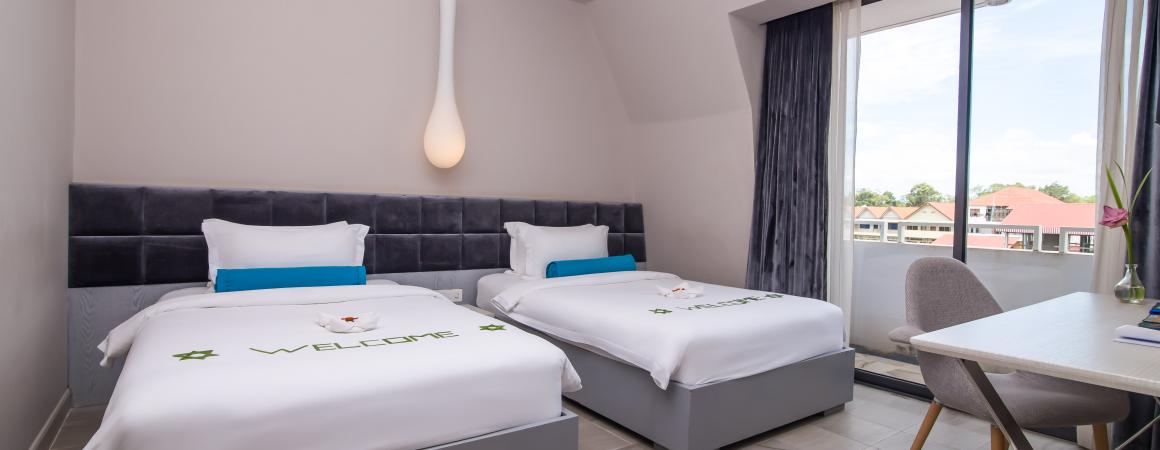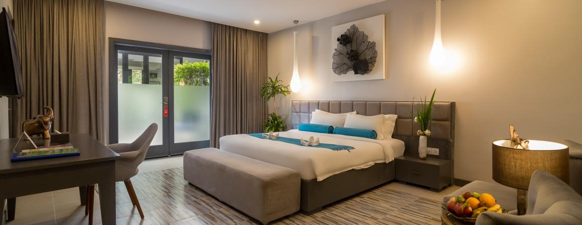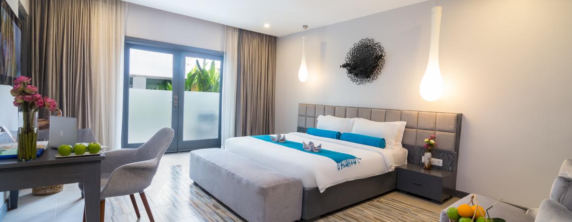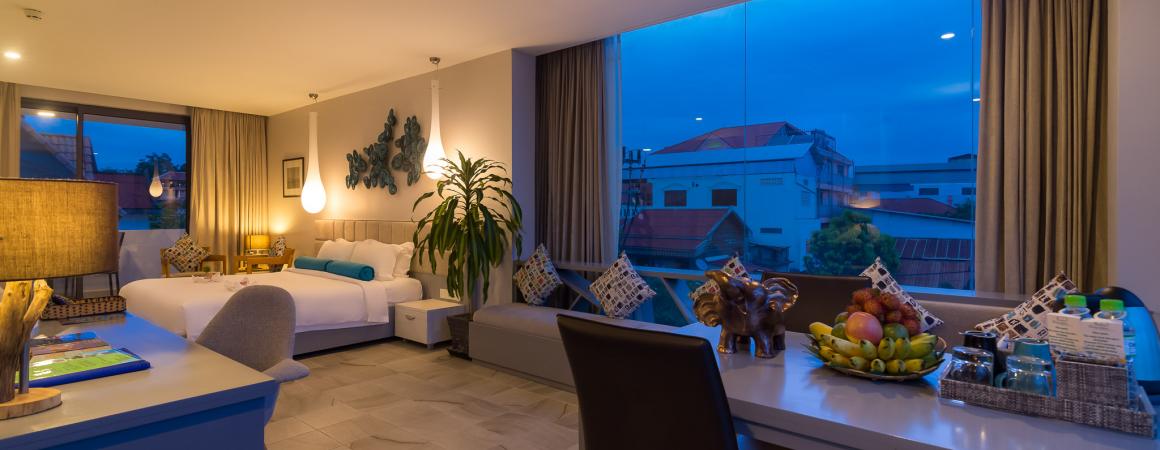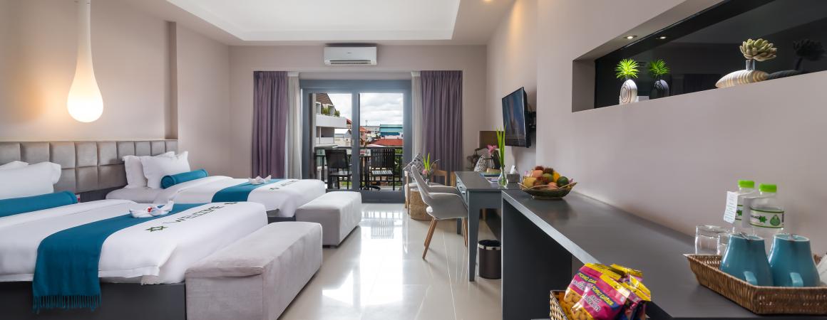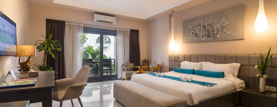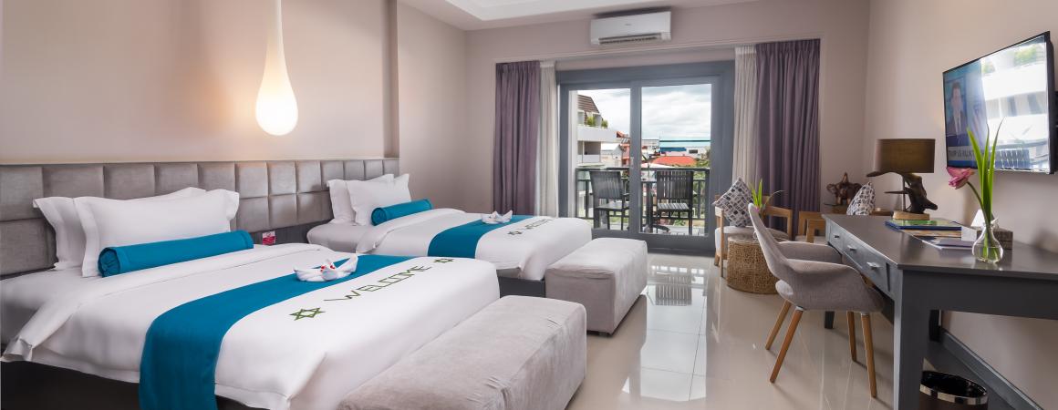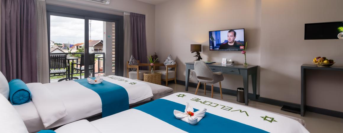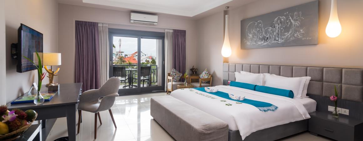 ‘Damrei’ in the Khmer language is the word for ‘Elephant’, a creature that played a major role in the ancient Khmer Empire. Damrei Angkor Hotel pays respects to this beautiful beast in and around the hotel. Newly opened in October 2015, this beautiful 54-rooms, 4-stars hotel is perfectly located for visitors to Siem Reap. The magnificent temples at Anchor Archaeological Complex, where you will visit the unforgettable Angkor Wat, are a short, 10-minute tuk tuk ride away. Siem Reap town and its large choice of restaurants, bars and shopping is all a short walk from the hotel, or you can use one of our dedicated, polite tuk tuk drivers. The facilities at the Damrei Angkor Hotel are second-to-none. After a hot, sticky day at the temples, relax by our salt-water swimming pool with a cold beer or a cocktail at the poolside bar. After a busy day shopping in the nearby markets, indulge in one of our many sumptuous Mtes Spa treatments or just relax on the Erawan Terrace. Our Aira Restaurant caters for breakfast, lunch and dinner. Choose from both Western and Asian dishes, served by our courteous, professional staff. If you prefer to stay a while in your air-conditioned room, you can of course call our room service. And of course it goes without saying that you will find your room is very well appointed with every amenity you expect, including free Wi-Fi, flat-screen TVs and last but not least, extremely comfortable beds.